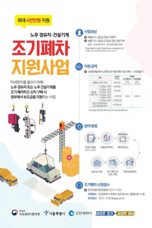 ÇϹݱâ Á¶±â ÆóÂ÷ ½ÅûÀº Áö³ 6¿ù 1ÀϺÎÅÍ ¼±Âø¼øÀ¸·Î Á¢¼ö ÁßÀ̸ç, Áö¿ø´ë»óÀº ¹èÃâ°¡½º 5µî±Þ °æÀ¯Â÷·Î ÀÚµ¿Â÷°ü¸®¹ý¿¡ µû¶ó °ü´É°Ë»ç °á°ú ÀûÇÕÆÇÁ¤À» ¹Þ°í, ½ÃÈï½Ã¿¡ µî·ÏµÈ Â÷·® Áß ½ÅûÀÏ ÀÌÀü 6°³¿ù ÀÌ»ó ¿¬¼ÓÀ¸·Î ´ë±â°ü¸®±Ç¿ª ¼¿ï¡¤ÀÎõ¡¤°æ±âµµ¿¡ µî·ÏµÈ Â÷·® µîÀÌ ÇØ´çµÈ´Ù.