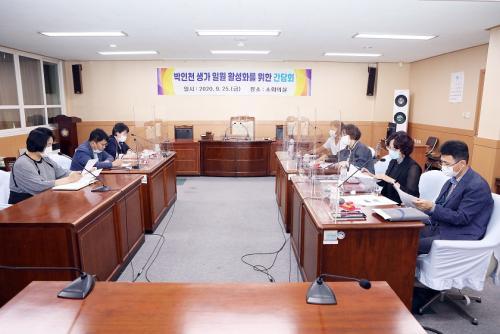 À̹ø °£´ãȸ´Â Äڷγª19·Î ÀÎÇØ ¹®È¿¹¼ú Ȱµ¿ÀÌ Ä§Ã¼µÈ »óȲ¿¡¼ ¹ÚÀÎõ »ý°¡ ÀÏ¿øÀ» µ¿±¸¸¦ ´ëÇ¥ÇÏ´Â ¹®È¿¹¼ú°ÅÁ¡ °ø°£À¸·Î ¸¸µé¾î °ü±¤ »óǰÈÇÏ´Â ¹æ¾ÈÀ» ¸ð»öÇϱâ À§ÇØ °ü·Ã ºÎ¼Àå ¹× »ó°¡¹ø¿µÈ¸ ȸ¿øµé°ú ÀÚ¸®¸¦ ÇÔ²²Çß´Ù.