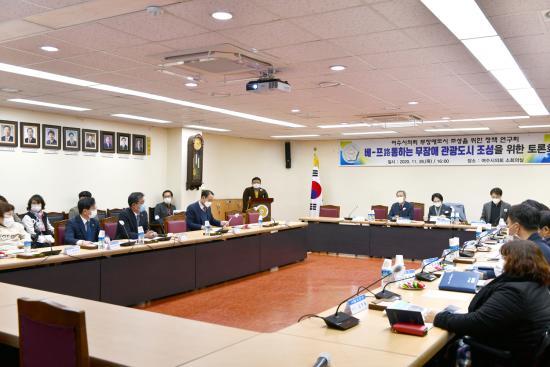 ÀÇ¿ø ¿¬±¸´ÜüÀÎ ¡®¹«Àå¾Öµµ½Ã Á¶¼º Á¤Ã¥¿¬±¸È¸¡¯ ÁÖ°üÀ¸·Î ¿¸° À̳¯ Åä·Ðȸ¿¡´Â ¹Î´öÈñ¡¤ÁÖÀçÇö¡¤³ªÇö¼ö¡¤°ÇöÅ ÀÇ¿øÀ» ºñ·ÔÇØ Àå¾ÖÀδÜü․»çȸº¹Áö½Ã¼³ °ü°èÀÚ, Åä¸ñ¼³°è°ü°èÀÚ, ½ÃÁ¤ºÎ ´ã´ç°úÀåµéÀÌ ÆÐ³Î·Î Âü¼®Çß´Ù.
