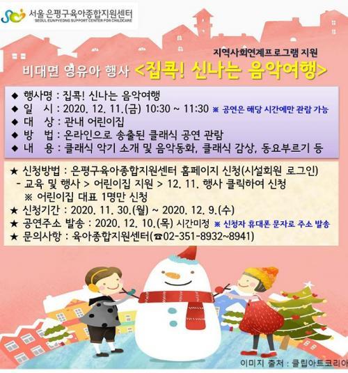 ½Åû ¹æ¹ýÀº ÀºÆò±¸À°¾ÆÁ¾ÇÕÁö¿ø¼¾ÅÍ È¨ÆäÀÌÁö¿¡¼ ¾î¸°ÀÌÁý ¿øÀå ¶Ç´Â º¸À°±³»ç ´ëÇ¥ 1¸íÀÌ »çÀü½ÅûÀ» ÇÏ¸é °ø¿¬ Àü³¯ °ø¿¬ ¸µÅ© ÁÖ¼Ò¸¦ ¹®ÀÚ·Î ¹Þ°Ô µÇ¸ç ÇØ´ç °ø¿¬ ½Ã°£ µ¿¾È °ü¶÷ÀÌ °¡´ÉÇÏ´Ù. 'ÁýÄÛ! ½Å³ª´Â À½¾Ç ¿©Çà' ºñ´ë¸é ¿µÀ¯¾Æ Çà»ç¿¡ °üÇÑ ÀÚ¼¼ÇÑ »çÇ×Àº ÀºÆò±¸À°¾ÆÁ¾ÇÕÁö¿ø¼¾ÅÍ È¨ÆäÀÌÁö¿¡¼ È®ÀÎÇÒ ¼ö ÀÖ´Ù.