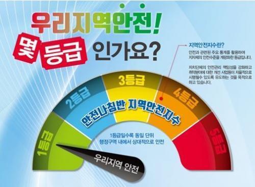 ÇàÁ¤¾ÈÀüºÎ¿¡¼ ¸Å³â °øÇ¥ÇÏ´Â ¡®Áö¿ª¾ÈÀüÁö¼ö¡¯´Â ÁöÀÚü ¾ÈÀü¼öÁØÀ» ±³Åë»ç°í, ÈÀç, »ýȰ¾ÈÀü, ÀÚ»ì, °¨¿°º´, ¹üÁË µî 6°³ ºÐ¾ß·Î ³ª´² Á¤·®È ÇÑ ÈÄ ÀÚÄ¡´Üüº°·Î 1¡5µî±ÞÀ» ºÎ¿©ÇÑ´Ù. 1µî±ÞÀϼö·Ï »ó´ëÀûÀ¸·Î ¾ÈÀüÇÏ´Ù´Â °ÍÀ» ÀǹÌÇÑ´Ù.