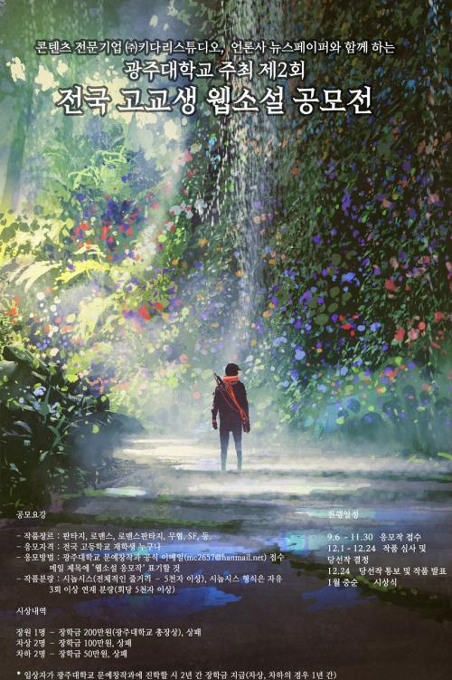 À̹ø À¥¼Ò¼³ °ø¸ðÀü ÀÛǰ Á¢¼ö´Â ¿À´Â 11¿ù 30ÀϱîÁöÀ̸ç, Á¦¸ñ¿¡´Â ¡®À¥¼Ò¼³ ÀÀ¸ðÀÛ¡¯ Ç¥±â¸¦ ÇÑ µÚ ±¤ÁÖ´ëÇб³ ¹®¿¹Ã¢ÀÛ°ú °ø½Ä À̸ÞÀÏ(mc2657@hanmail.net)·Î º¸³»¸é µÈ´Ù. ´ç¼±ÀÛ ¹ßÇ¥´Â 12¿ù 24ÀÏÀÌ´Ù.