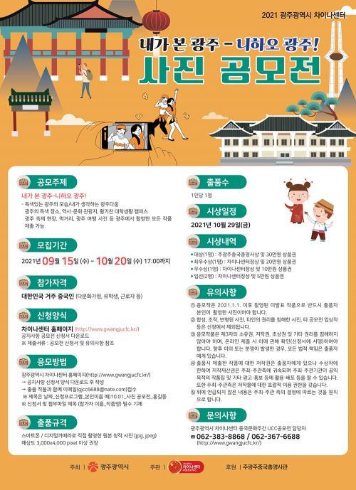 ³»°¡ »ý°¢ÇÏ´Â ±¤ÁÖ´Ù¿ò, Ư»ö ÀÖ´Â ±¤ÁÖÀÇ ¸ð½À, ±¤ÁÖ ÃàÁ¦ ÇöÀå, Ȱ±âÂù ´ëÇÐ »ýȰ Ä·ÆÛ½º µî ±¤ÁÖ¿Í °ü·ÃÇÑ ¸ðµç ÀÚÀ¯ ÁÖÁ¦·Î Âü¿© °¡´ÉÇÑ À̹ø °ø¸ðÀüÀº ±¤ÁÖ °ÅÁÖ Áß±¹ÀÎ(´Ù¹®È°¡Á¤, À¯Çлý, ±Ù·ÎÀÚ µî)À̶ó¸é ´©±¸³ª Âü¿© °¡´ÉÇÏ¸ç °¢ ºÎ¹®º°·Î ´ë»ó(ÁÖ±¤ÁÖÁß±¹ÃÑ¿µ»ç»ó), ÃÖ¿ì¼ö»ó, ¿ì¼ö»ó, ÀÔ¼±(ÀÌ»ó ±¤ÁÖ±¤¿ª½Ã Â÷À̳ª¼¾ÅÍÀå»ó)ÀÌ ¼ö¿©µÈ´Ù.