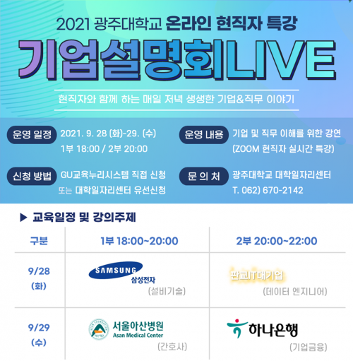 À̹ø ±â¾÷¼³¸íȸ´Â »ï¼ºÀüÀÚ(¼³ºñ±â¼ú)¿Í ÆÇ±³IT´ë±â¾÷(µ¥ÀÌÅÍ ¿£Áö´Ï¾î), ¼¿ï¾Æ»êº´¿ø(°£È£»ç), ÇϳªÀºÇà(±â¾÷±ÝÀ¶) µîÀÇ ±â¾÷ ÇöÁ÷ÀÚ°¡ Á÷Á¢ Âü¿©ÇØ Ãë¾÷À» Èñ¸ÁÇÏ´Â 150¿© ¸íÀÇ Çлý°ú ½Ç½Ã°£ ÅäÅ©¼î Çü½ÄÀ¸·Î ÁøÇàµÆ´Ù.