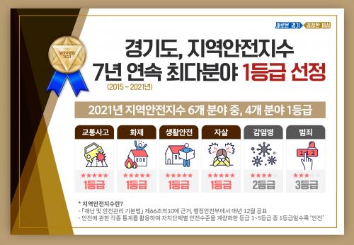 9ÀÏ ÇàÁ¤¾ÈÀüºÎ ¹ßÇ¥¿¡ µû¸£¸é °æ±âµµ´Â Àüü 6°³ Æò°¡ÁöÇ¥ °¡¿îµ¥ ±³Åë»ç°í, ÈÀç, ÀÚ»ì, »ýȰ¾ÈÀü 4°³ ºÐ¾ß¿¡¼ ¸ðµÎ 1µî±ÞÀ» ȹµæÇØ ¾ÈÀüÇÑ »ýȰȯ°æÀ» ±¸ÃàÇϰí ÀÖ´Â °ÍÀ¸·Î ³ªÅ¸³µ´Ù.