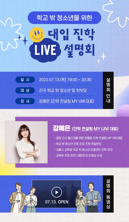 Àú³á 7½ÃºÎÅÍ 8½Ã 30ºÐ±îÁö °³²Àΰ À¯Æ©ºê ä³ÎÀ» ÅëÇØ ÁøÇàÇÏ´Â À̹ø ¼³¸íȸ´Â °ËÁ¤°í½Ã ¸ÂÃãÇü ÁøÇÐ ÄÁ¼³ÆÃ MY UNIÀÇ °¿¹Àº ´ëÇ¥°¡ ¸Ã´Â´Ù.