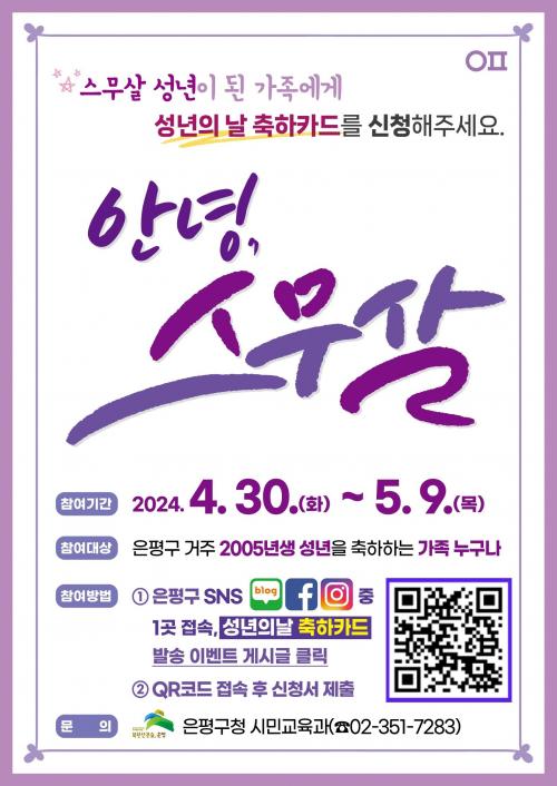 Âü¿©´Â ¿À´Â 9ÀϱîÁö ÀºÆò±¸ SNS(ºí·Î±×, ÆäÀ̽ººÏ, ÀνºÅ¸) Áß ÇÑ °÷À» Á¢¼ÓÇØ ¼º³âÀÇ ³¯ ÃàÇÏÄ«µå ½Åû À̺¥Æ® °Ô½Ã±ÛÀ» Ŭ¸¯Çϰí QRÄڵ带 ÅëÇØ ½Åû¼¸¦ Á¦ÃâÇÏ¸é µÈ´Ù.