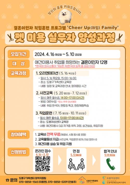 µµºÀ±¸°¡Á·¼¾ÅÍ(¼¾ÅÍÀå °Áø¾Æ)¿Í µµºÀ¿©¼º¼¾ÅÍ(°üÀå ¹ÚÂù¾Ö)°¡ ÇÔ²² ¸¶·ÃÇÑ À̹ø °úÁ¤Àº »çÀü±³À°, Á÷¾÷ÈÆ·Ã, »çÈİü¸®·Î ±¸¼ºµÈ´Ù. Àü °úÁ¤Àº µµºÀ±¸°¡Á·¼¾ÅͰ¡ ¿î¿µ‧°ü¸®Çϸç, µµºÀ¿©¼º¼¾ÅÍ´Â Á÷¾÷ÈÆ·Ã°ú »çÈİü¸®¸¦ ´ã´çÇÑ´Ù.