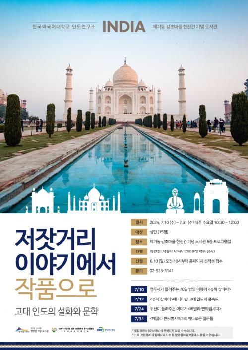 Çѱ¹¿Ü±¹¾î´ëÇб³ Àεµ¿¬±¸¼Ò¿Í Çù·ÂÇØ 7. 10.~7. 31.±îÁö ¸ÅÁÖ ¼ö¿äÀÏ µµ¼°ü 5Ãþ ÇÁ·Î±×·¥½Ç¿¡¼ ÁøÇàµÇ´Â À̹ø °ÀÇ´Â 1Â÷½Ã(7/10) ¾Þ¹«»õ°¡ µé·ÁÁÖ´Â 70ÀÏ ¹ãÀÇ À̾߱â, 2Â÷½Ã(7/17) °í´ë ÀεµÀÇ Ç³¼Óµµ, Â÷½Ã(7/24) ±Í½ÅÀÌ µé·ÁÁÖ´Â À̾߱â, 4Â÷½Ã(7/31) ¡®º£µþ¶ó ºþÂ¥ºö»þ¶ì¡¯ÀÇ ±î´Ù·Î¿î Áú¹®µé·Î ±¸¼ºµÇ¾îÁ® ÀÖ´Ù.