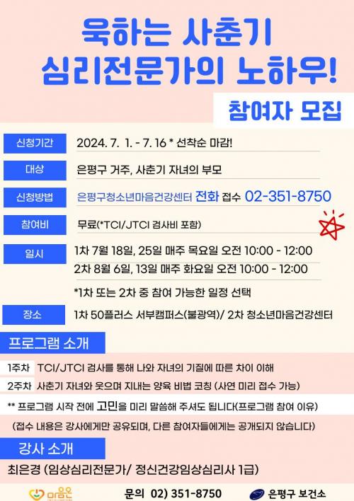 ¼¾ÅÍ´Â ¿À´Â 18ÀϺÎÅÍ ¡®¿íÇÏ´Â »çÃá±â ½É¸®Àü¹®°¡ÀÇ ³ëÇϿ졯¸¦ ÁÖÁ¦·Î ¸¶À½°Ç° ÇÁ·Î±×·¥À» ¿î¿µÇÑ´Ù. »çÃá±â ÀÚ³à¿ÍÀÇ °Ç°ÇÑ ¼ÒÅë ¹æ¹ý¿¡ °üÇØ »çÃá±â Àڳฦ µÐ ºÎ¸ð¿Í °øÀ¯ÇϰíÀÚ ÇÑ´Ù. ºÎ¸ð¿Í ÀÚ³à ¼º°Ý, ±âÁú°Ë»ç(TCI/JTCI)µµ ¹«·á·Î ÁøÇàµÈ´Ù.