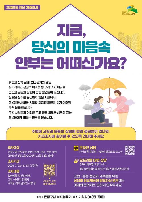 Á¶»ç ±â°£Àº ³»´Þ 23ÀϱîÁö¸ç, Æ÷½ºÅ͸¦ Âü°íÇØ Å¥¾Ë(QR)ÄÚµå ¶Ç´Â ÇØ´ç ¿Â¶óÀÎ ¸µÅ©¿¡ Á¢¼ÓÇϰųª ÀºÆò±¸Ã» ´©¸®Áý µîÀ» ÅëÇØ Á¶»ç¿¡ Âü¿©ÇÒ ¼ö ÀÖ´Ù.