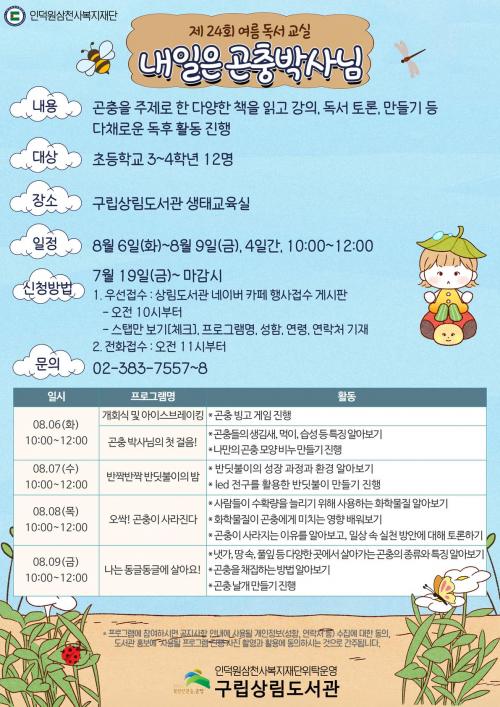 ¿©¸§ µ¶¼±³½ÇÀº ³»´Þ 6ÀϺÎÅÍ 9ÀϱîÁö Ã¥À» ÅëÇØ °ïÃæ¿¡ ´ëÇØ ¾Ë¾Æº¸´Â ³»¿ëÀ¸·Î ¿¸°´Ù. »ýÅÂ¿Í ÀÚ¿¬º¸È£¿¡ ´ëÇÑ ¾î¸°À̵éÀÇ °ü½ÉÀ» ³ôÀÏ ¼ö ÀÖµµ·Ï Åä·Ð, ¸¸µé±â, ÄûÁî µî ´Ùä·Î¿î µ¶ÈÄ È°µ¿À» ÁøÇàÇÑ´Ù.