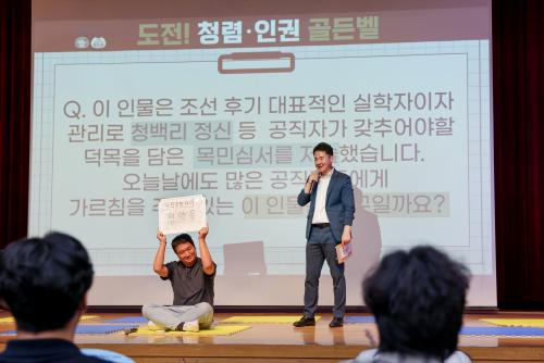 ƯÈ÷ ¸¶Áö¸· °ñµçº§ ¹®Á¦´Â µµºÀ±¸Ã»ÀåÀÌ Á÷Á¢ ÃâÁ¦ÇØ Àǹ̸¦ ´õÇß´Ù. û¹é¸® Á¤½ÅÀ» ³Î¸® ¾Ë¸° ¿ª»çÀû Àι° Á¤¾à¿ë¿¡ ´ëÇÑ ¹®Á¦·Î, Æò¼Ò ±¸Ã»ÀåÀÌ Á÷¿øµé¿¡°Ô ÀüÇϰíÀÚ Çϴ û·Å°ú ÀαÇÀÇ °¡Ä¡¸¦ °Á¶ÇÏ´Â ¸Þ½ÃÁö°¡ ´ã°ÜÀÖ¾ú´Ù.