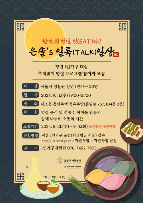 ¿À´Â 11ÀÏ ¿ÀÈÄ 7½ÃºÎÅÍ ÀºÆò±¸ ´ëÁ¶µ¿ û³âÁÖÅà °øÀ¯Áֹ濡¼ Àü¹® °»ç¿Í ÇÔ²² À°Àü µî ¸íÀý À½½ÄÀ» ¸¸µé°í ÀüÅëÁÖ¸¦ Ȱ¿ëÇÑ ÇÏÀ̺¼À» ¸¸µç´Ù. °£´Ü »óÂ÷¸² ÈÄ ÇÔ²² ¸¸µç À½½ÄÀ» ³ª´² ¸ÔÀ¸¸ç ¼·ÎÀÇ °ü½É»ç¿Í °í¹ÎÀ» ³ª´©´Â µî Áñ°Ì°Ô À̾߱â²ÉÀ» ÇÇ¿ï ¿¹Á¤ÀÌ´Ù.