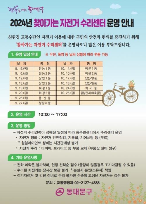 ¼ö¸®¼¾ÅÍ´Â 9¿ù 5ÀÏ(¸ñ) Àü³ó1µ¿ Áֹμ¾Å͸¦ ½ÃÀÛÀ¸·Î 10¿ù±îÁö ÃÑ 15ȸ(1ȸ Àå¼Ò ¹ÌÁ¤)¿¡ °ÉÃÄ ¿î¿µµÉ ¿¹Á¤ÀÌ´Ù. ÀÚÀü°Å ¼ö¸®¸¦ ¿øÇÏ´Â ÁֹεéÀº ÀÏÁ¤¿¡ ¸ÂÃç ÇØ´ç Áֹμ¾Å͸¦ ¹æ¹®ÇÏ¸é µÈ´Ù.