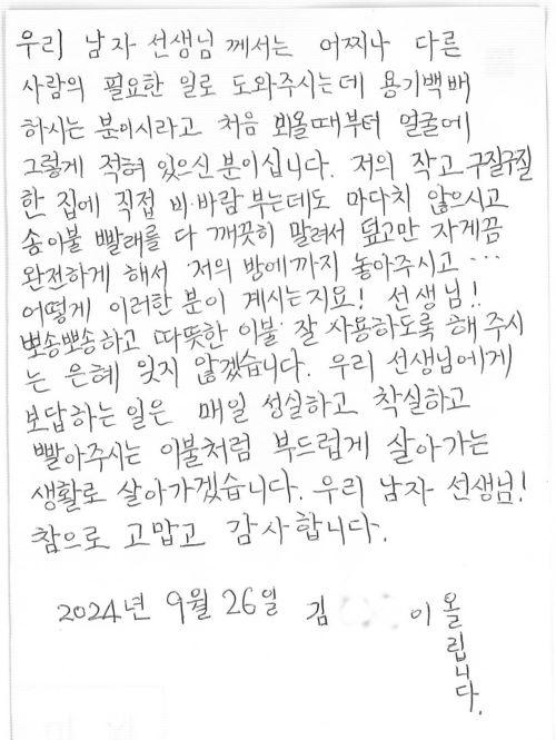 ÆíÁö¸¦ Àü´ÞÇÑ ¾î¸£½ÅÀº ¡°È¥ÀÚ¼´Â À̺ÒÀ» »¡°í ÇÞºµ¿¡ ³Î±âµµ ¾î·Á¿ü´Âµ¥ ±ú²ýÇÑ À̺ÒÀ» µ¤À» ¼ö ÀÖ¾î¼ ³Ê¹« °¨»çÇÏ´Ù¡±¸ç ¡°À̺ÒÀ» ¼ö°ÅÇÏ°í ¹è´ÞÇÏ´Â ºÐµéÀÌ Ä£ÀýÇØ ´öºÐ¿¡ ¿Ü·ÓÁö ¾Ê°í µû¶æÇÑ Á¤À» ´À³¥ ¼ö ÀÖ¾ú´Ù¡±°í ¸»Çß´Ù.