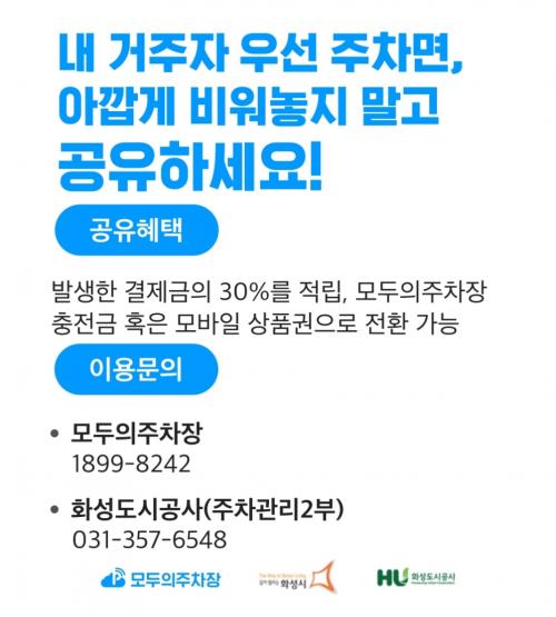 ¡®ÁÖÂ÷Àå °øÀ¯ Ç÷§Æû¡¯Àº °ÅÁÖÀÚÁÖÂ÷ÀåÀÇ ºñ¾îÀÖ´Â ÁÖÂ÷¸éÀ» ¸ðµÎÀÇÁÖÂ÷Àå ¾ÛÀ» ÅëÇØ ¿øÇÏ´Â ½Ã°£´ë¿¡ ÀÚÀ¯·Ó°Ô ÀÌ¿ëÇÏ´Â ¹æ½ÄÀ¸·Î ÀÌ¿ë¹æ¹ý, ¿ä±Ý µîÀº ȼº½Ã ÅëÇÕÁÖÂ÷Æ÷Å»(https://smartparking.hscity.go.kr)À» ÅëÇÏ¿© È®ÀÎÇÒ ¼ö ÀÖ´Ù.