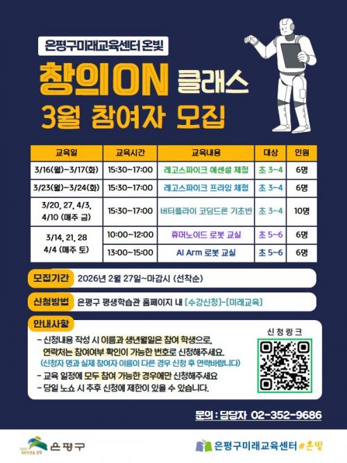 ÀÚ¼¼ÇÑ »çÇ×Àº ÀºÆò±¸ Æò»ýÇнÀ°ü ȨÆäÀÌÁö ¸ðÁý°ø°í¸¦ Âü°íÇϰųª, ÀºÆò±¸¹Ì·¡±³À°¼¾ÅÍ ¿Âºû(02-352-9686)À¸·Î ¹®ÀÇÇÏ¸é µÈ´Ù.