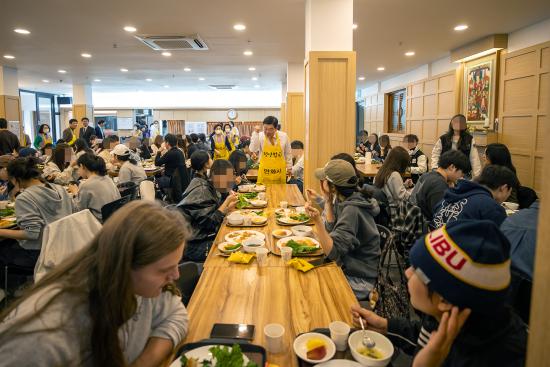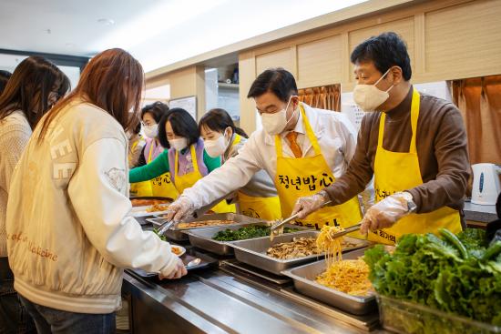 ½º´Ôµé°ú ÀÚ¿øºÀ»çÀÚµéÀÌ ºÐÁÖÈ÷ À½½ÄÀ» ³ª¸£°í, °ø¾ç°£ ¾Õ¿¡¼´Â Çлýµé³¢¸® ¡°¿À´Ã ¸Þ´º°¡ ¹¹³Ä¡±¸ç ¿ôÀ½ ¼¯ÀÎ ´ëȸ¦ ÁÖ°í¹Þ¾Ò´Ù. ±× ÁÙ ¾Õ¿¡ ÀÌÇÊÇü µ¿´ë¹®±¸Ã»Àåµµ ¼¹´Ù. Çлýµé¿¡°Ô Á÷Á¢ À½½ÄÀ» °Ç³×¸ç ¡°¹ä Àß Ã¬°Ü ¸Ô°í, Çо÷°ú ¹Ì·¡ Áغñµµ Èû³»¶ó¡±°í ¸»À» °Ç³Þ´Ù. ÀÌ ±¸Ã»ÀåÀº ¿¬È»ç ¡®Ã»³â¹äãý¡¯ ÇöÀå¿¡¼ ¹è½ÄÀÚ·Î Âü¿©ÇØ ´ëÇлýµéÀ» °Ý·ÁÇß´Ù.