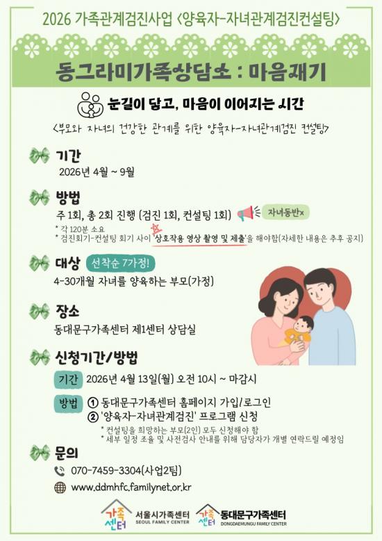 ¡®¾çÀ°ÀÚ-ÀÚ³à°ü°è°ËÁø¡¯Àº 4°³¿ù¿¡¼ 30°³¿ù »çÀÌÀÇ Àڳฦ ¾çÀ°ÇÏ´Â ºÎ¸ð¸¦ ´ë»óÀ¸·Î ÇÑ´Ù. ºÎ¸ð¿Í ÀÚ³à °£ »óÈ£ÀÛ¿ëÀ» ºÐ¼®Çϰí, ¾ÆÀÌÀÇ ¹ß´Þ Ư¼º°ú Çൿ¿¡ ´ëÇÑ ÀÌÇØ¸¦ ¹ÙÅÁÀ¸·Î ¾çÀ° ¹æ½ÄÀ» Á¡°ËÇÒ ¼ö ÀÖµµ·Ï ±¸¼ºµÆ´Ù. µ¿ÀÏÇÏ°Ô ÃÑ 2ȸ±â(°ËÁø 1ȸ, ÄÁ¼³ÆÃ 1ȸ)·Î ¿î¿µµÇ¸ç, ¼±Âø¼ø 7°¡Á¤À» ¸ðÁýÇÑ´Ù.