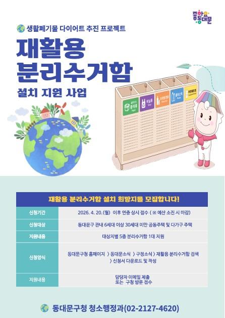 Áö¿ø ´ë»óÀº °ü³» 6¼¼´ë ÀÌ»ó 30¼¼´ë ¹Ì¸¸ÀÇ ¼Ò±Ô¸ð °øµ¿ÁÖÅðú ¿ø·ë µî ´Ù°¡±¸ÁÖÅÃÀÌ´Ù. ´Ù¸¸ ¹ý·ÉÀ̳ª Á¶·Ê¿¡ µû¶ó ºÐ¸®¼ö°Å ½Ã¼³ ¼³Ä¡°¡ Àǹ«ÈµÈ ½ÅÃà °ÇÃ๰Àº ´ë»ó¿¡¼ Á¦¿ÜµÈ´Ù. ±¸´Â ¿ÃÇØ ÃÑ 40°³¼Ò¸¦ ¼±Á¤ÇØ ´ë»óÁöº°·Î 5Á¾ ºÐ¸®¼ö°ÅÇÔÀ» Áö¿øÇÒ °èȹÀÌ´Ù. ½ÅûÀº 4¿ù 20ÀϺÎÅÍ ¿¬Áß »ó½Ã·Î ¹ÞµÇ, ¿¹»êÀÌ ¼ÒÁøµÇ¸é Á¶±â Á¾·áµÈ´Ù. ½ÅûÀÌ ¸¹À» °æ¿ì¿¡´Â Á¢¼ö ¼ø¼¿Í ¼³Ä¡ Çʿ伺, ¼³Ä¡ Àå¼ÒÀÇ ÀûÁ¤¼º µîÀ» ÇÔ²² µûÁ® Áö¿ø ´ë»óÀ» Á¤ÇÒ ¹æÄ§ÀÌ´Ù.